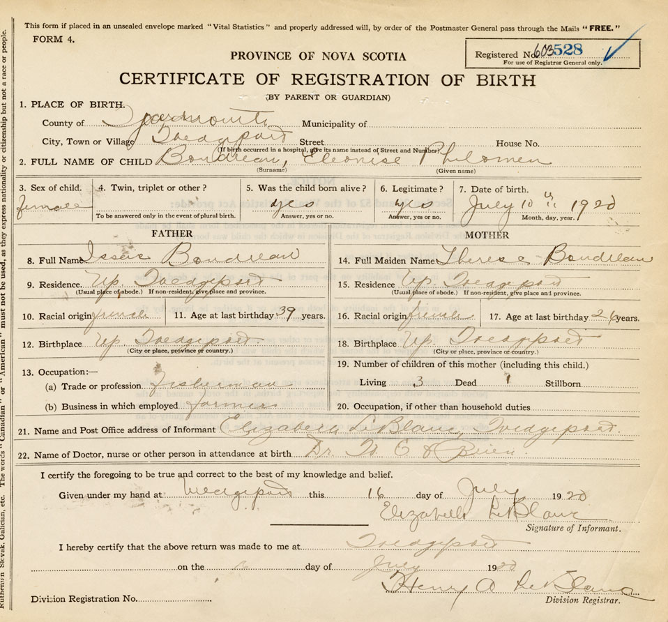 21. Name and Post Office address of Informant Elizabeth LeBlanc Wedgeport