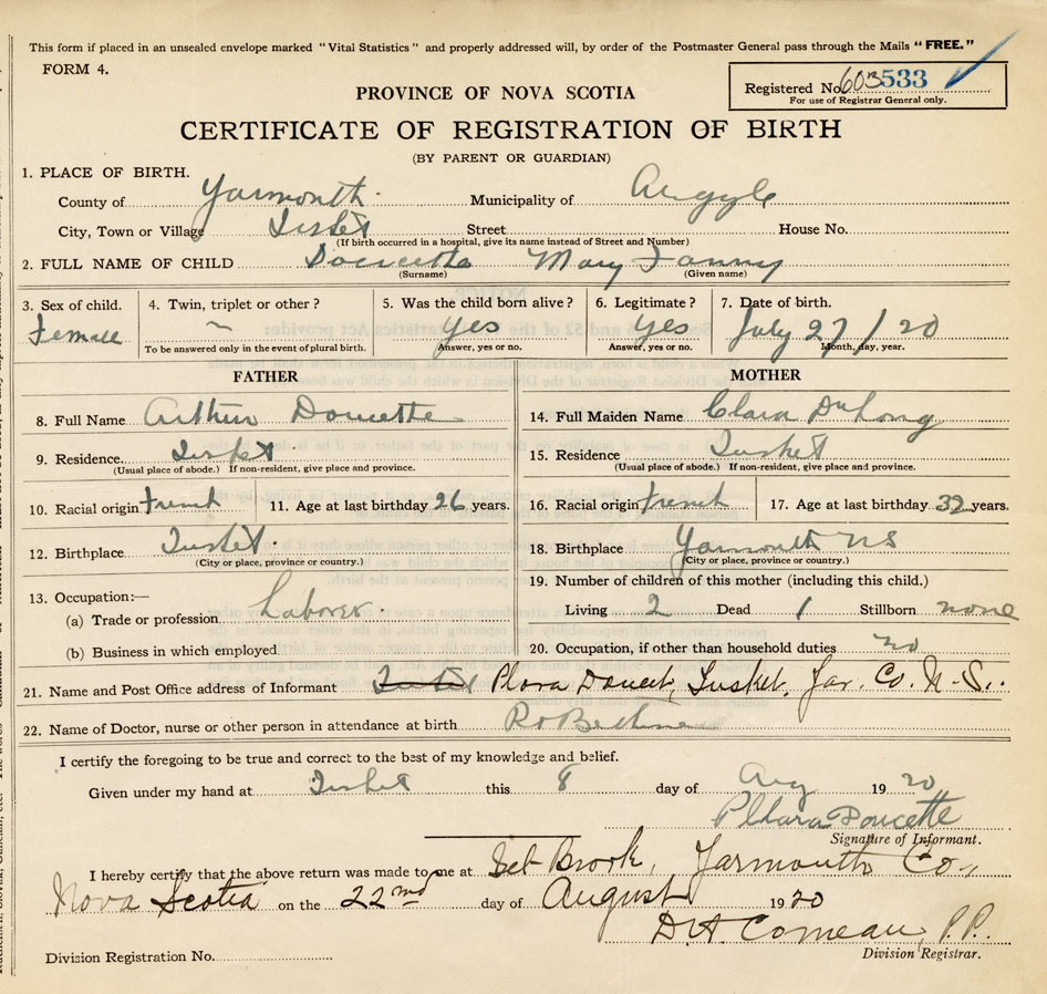 21. Name and Post Office address of Informant Clara Doucette Tusket, Yar. Co.