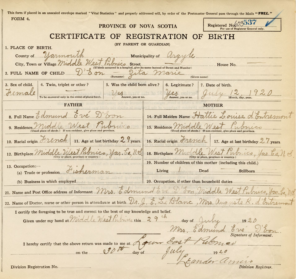 21. Name and Post Office address of Informant Mrs. Edmund Evé D'Eon Middle West Pubnico, Yar. Co.