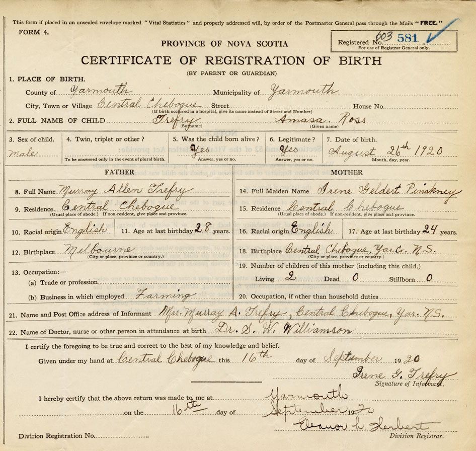21. Name and Post Office address of Informant Irene G. Trefry Central Chebogue, Yar. N.S.