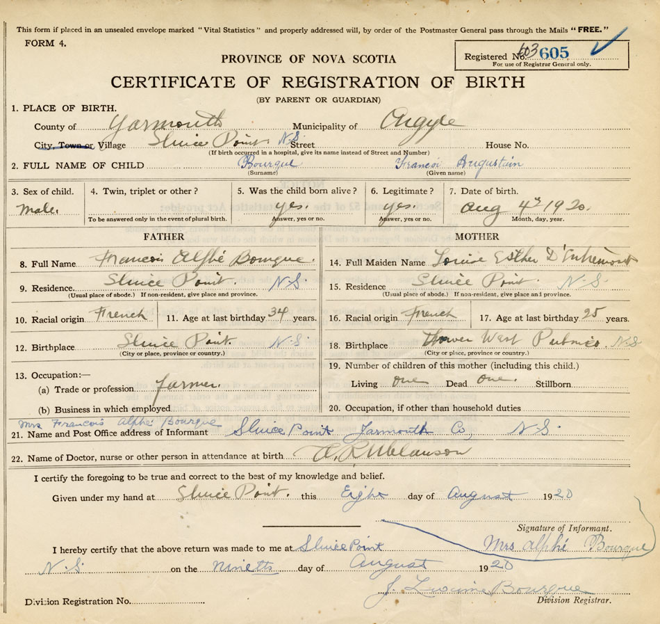 21. Name and Post Office address of Informant Mrs. Francois Alphé Bourque Sluice Point, Yarmouth Co.