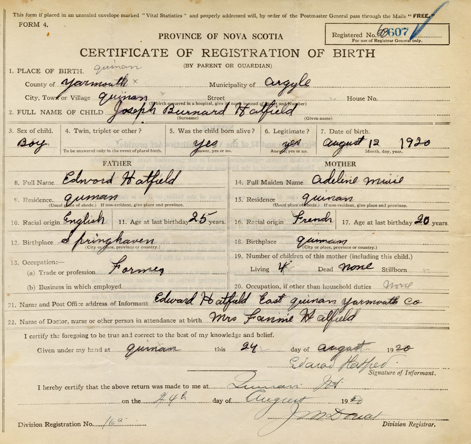 21. Name and Post Office address of Informant Edward Hatfield East Quinan, Yarmouth Co.