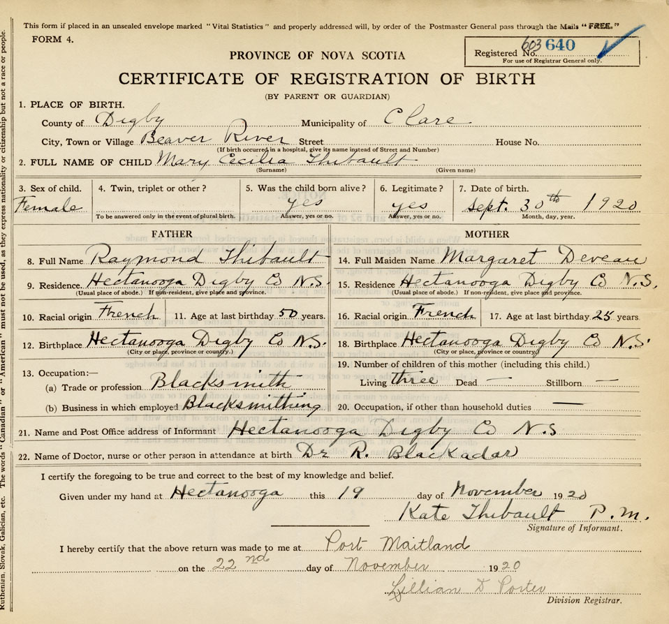 21. Name and Post Office address of Informant Kate Thibault P.M. Hectanooga, Digby Co.