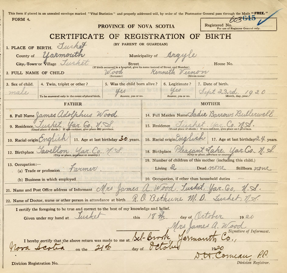 21. Name and Post Office address of Informant Mrs. James A. Wood Tusket, Yar. Co.