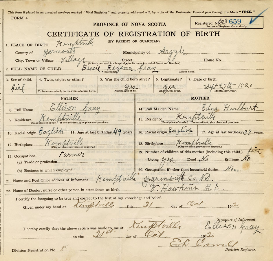 21. Name and Post Office address of Informant Ellison Gray Kemptville, Yarmouth Co.