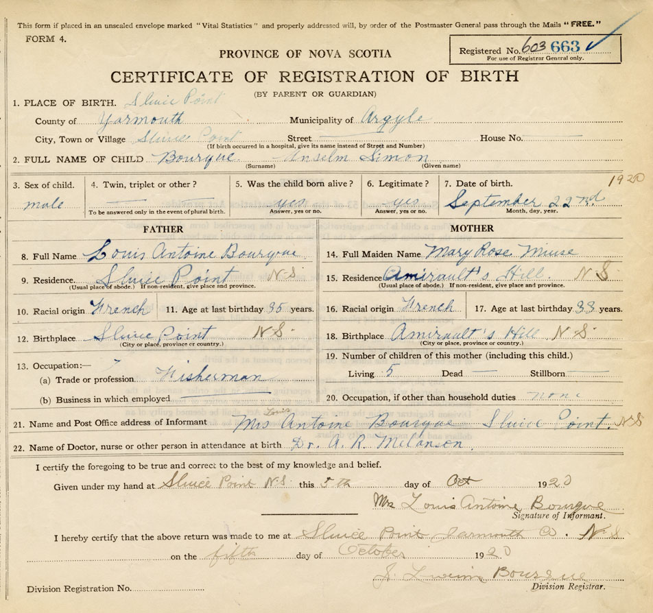 21. Name and Post Office address of Informant Mrs. Louis Antoine Bourque Sluice Point