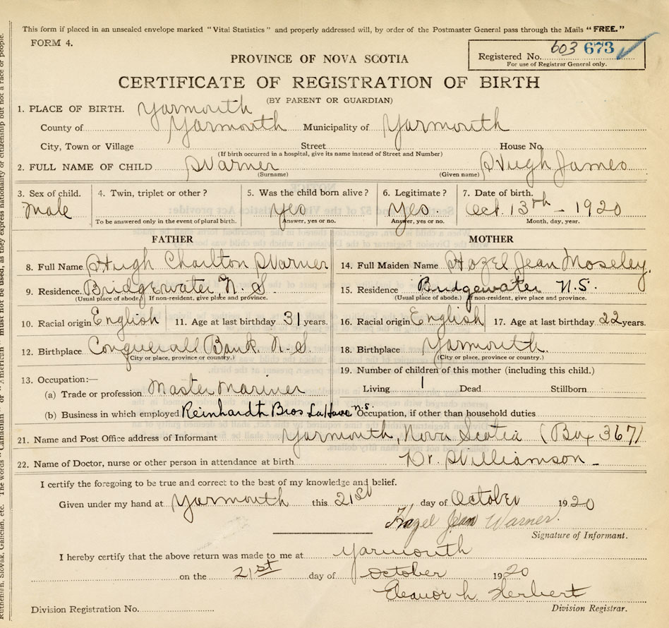 21. Name and Post Office address of Informant Hazel Jean Warner Yarmouth (Box 367)