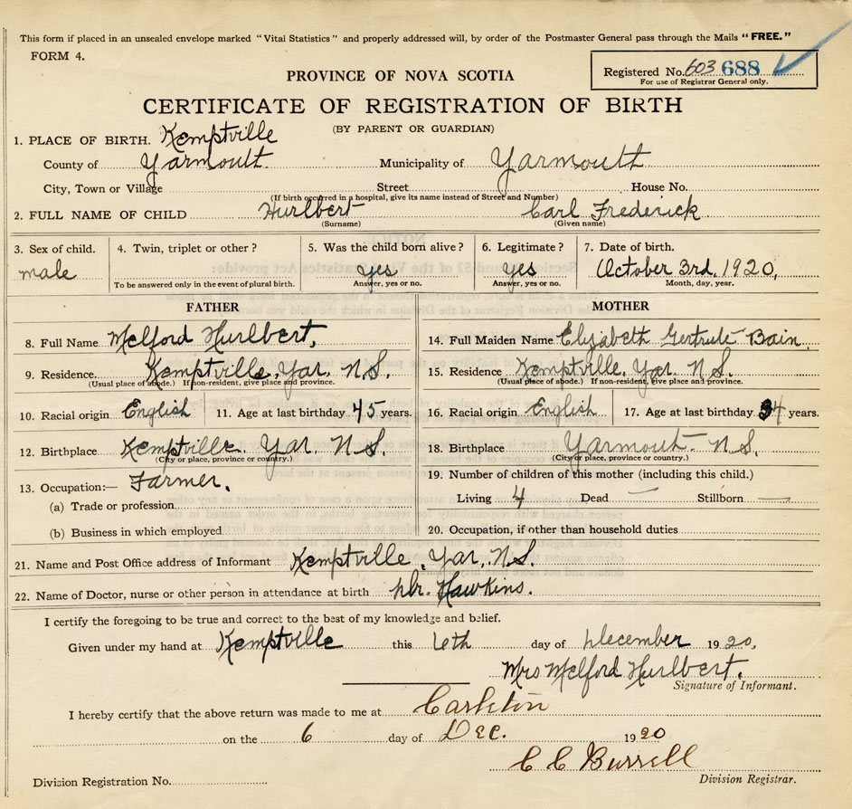 21. Name and Post Office address of Informant Mrs. Melford Hurlbert Kemptville, Yar. N.S.