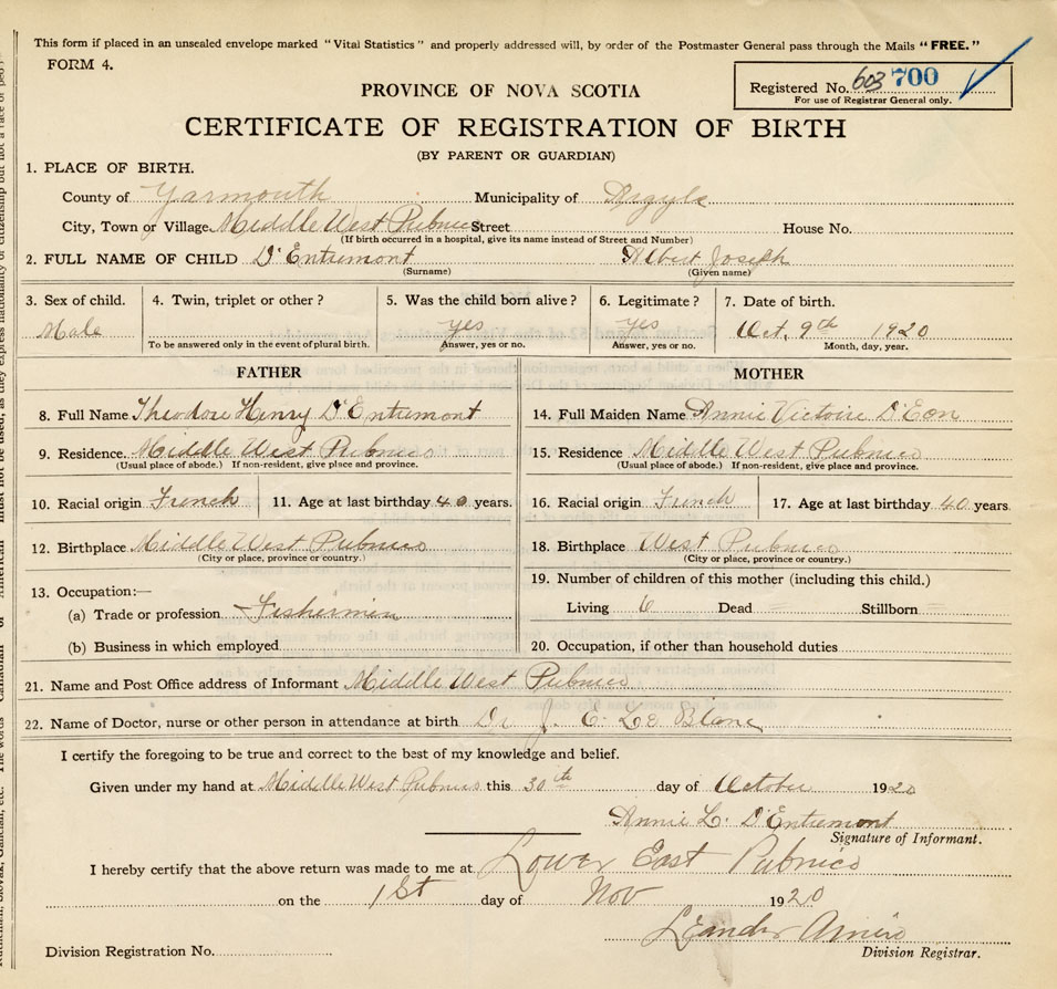 21. Name and Post Office address of Informant Annie L. D'Entremont Middle West Pubnico