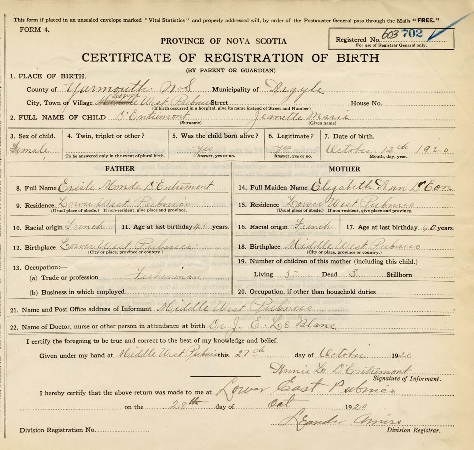21. Name and Post Office address of Informant Annie L. D'Entremont Middle West Pubnico