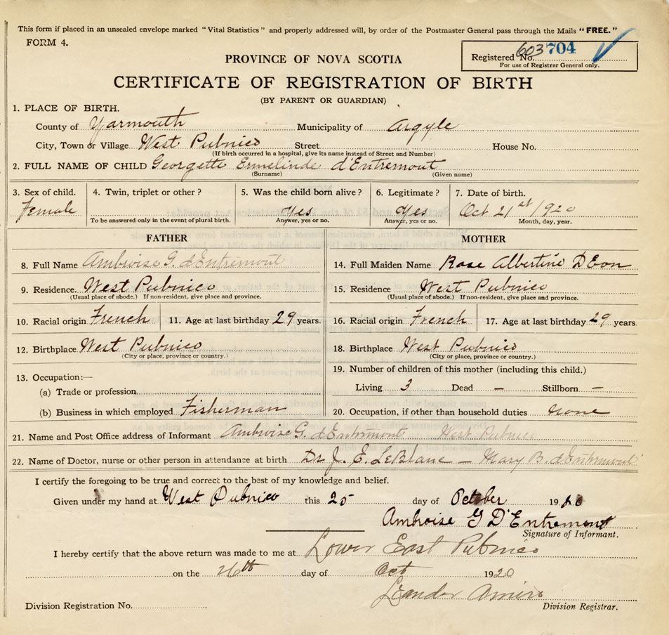 22. Name of Doctor, nurse or other person in attendance at birth Dr. J. E. LeBlanc, Mary B. d'entremont