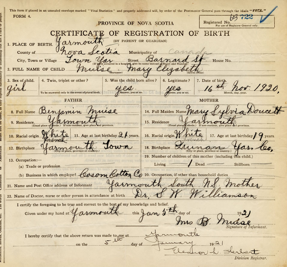 21. Name and Post Office address of Informant Mrs. B. Muise Yarmouth South