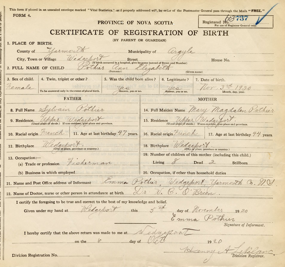 21. Name and Post Office address of Informant Emma Pothier Wedgeport, Yarmouth Co.