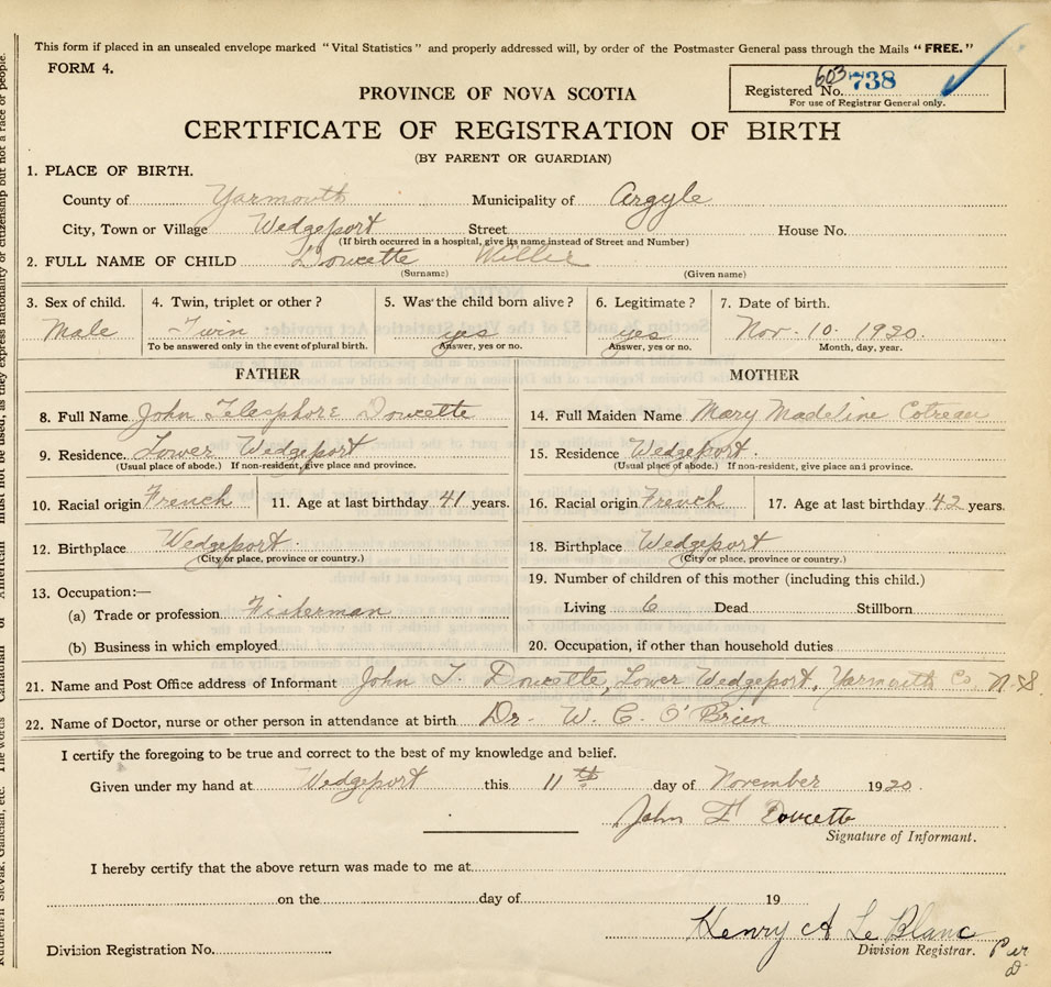 21. Name and Post Office address of Informant John T. Doucette Lower Wedgeport, Yarmouth Co.