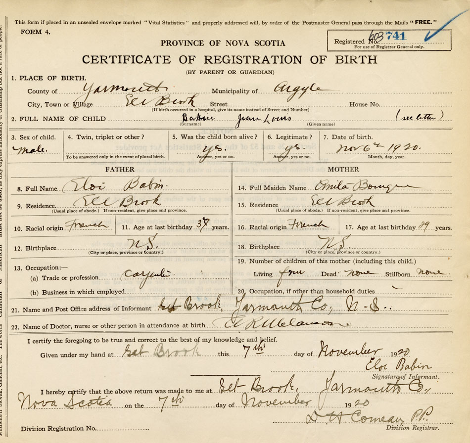 21. Name and Post Office address of Informant Eloi Babin Eel Brook, Yarmouth Co.
