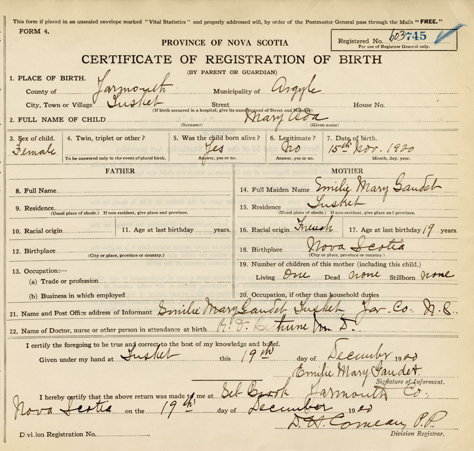 21. Name and Post Office address of Informant Emilie Mary Gaudet Tusket, Yar. Co.