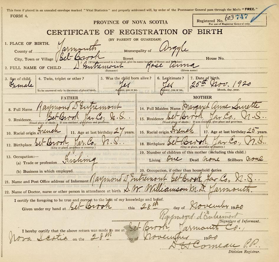 21. Name and Post Office address of Informant Raymond d'Entremont Eel Brook, Yar. Co.