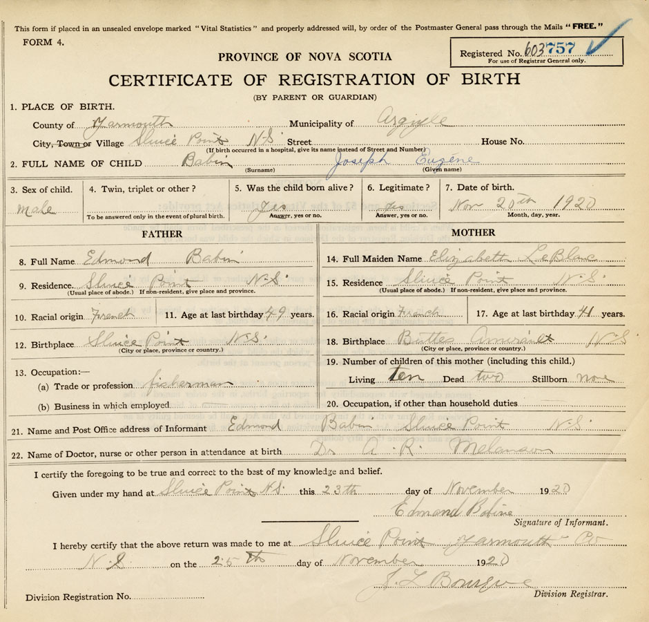 21. Name and Post Office address of Informant Edmond Babin Sluice Point