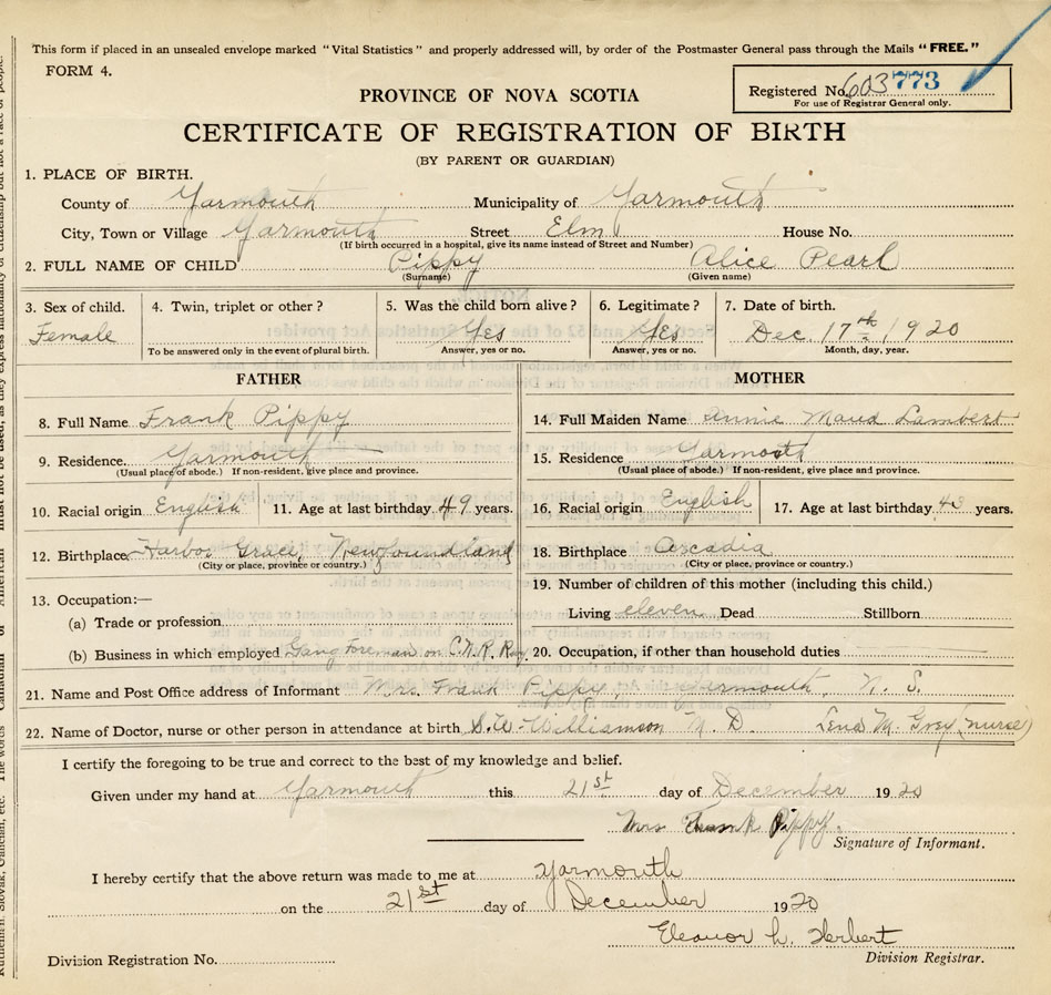 21. Name and Post Office address of Informant Mrs. Frank Pippy Yarmouth. N.S.