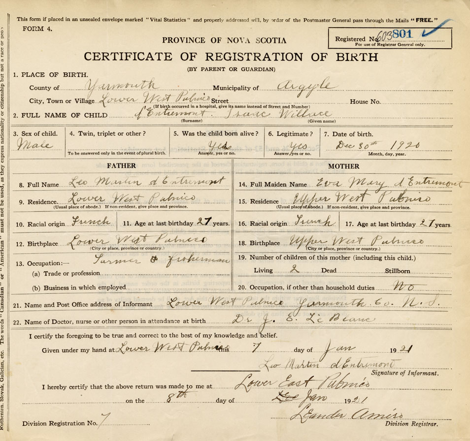 21. Name and Post Office address of Informant Leo Martin d'Entremont Lower West Pubnico, Yarmouth Co.