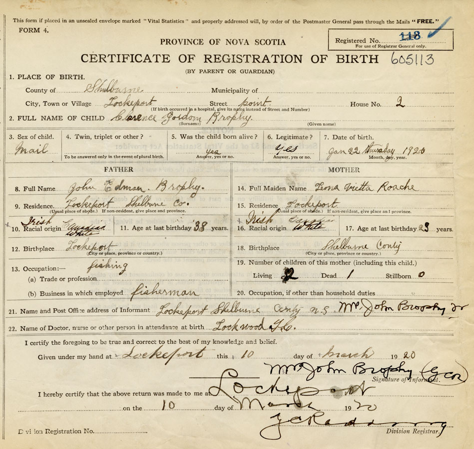 21. Name and Post Office address of Informant Mrs. John Brophy Lockeport, Shelburne County