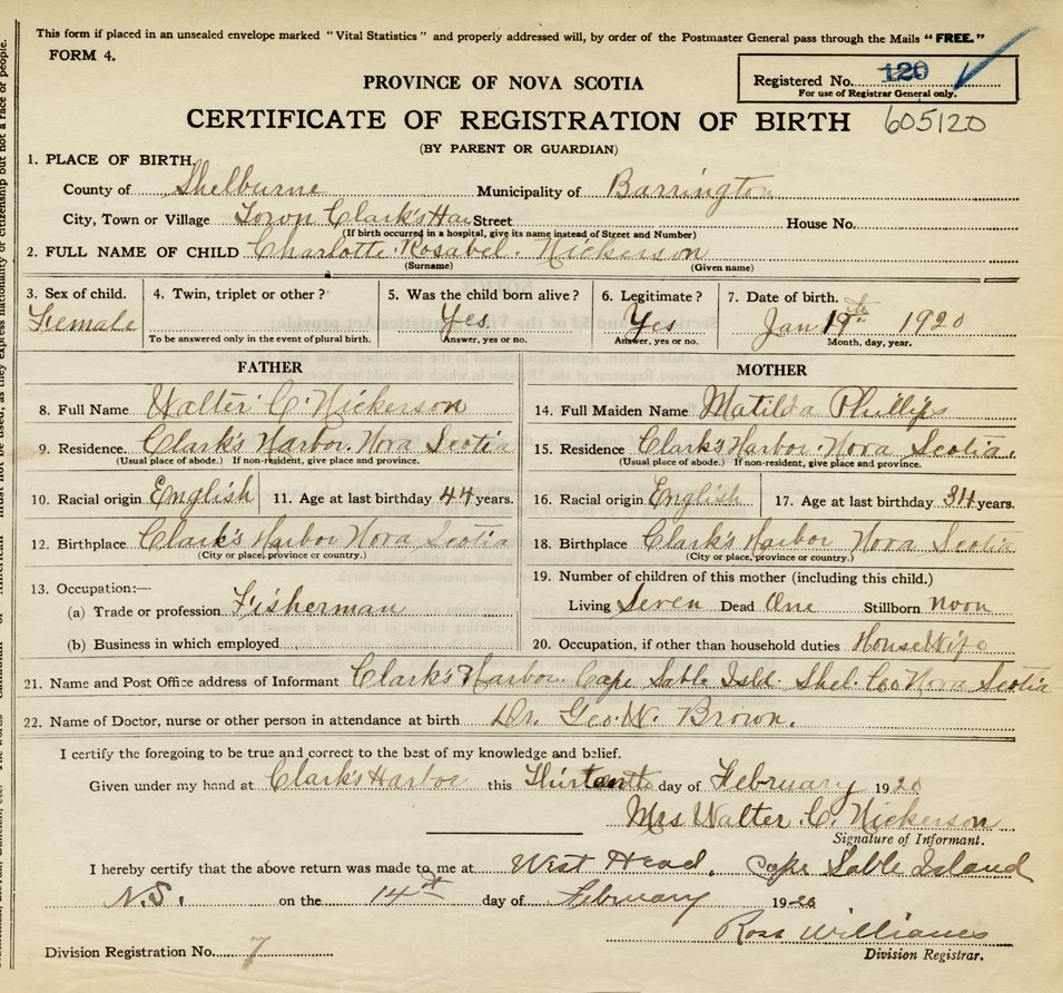 21. Name and Post Office address of Informant Mrs. Walter C. Nickerson Clarks Harbor, Cape Sable Island, Shel. Co.
