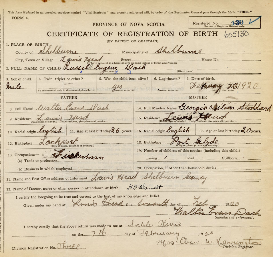 21. Name and Post Office address of Informant Walter Evans Dash Lewis Head, Shelburne County