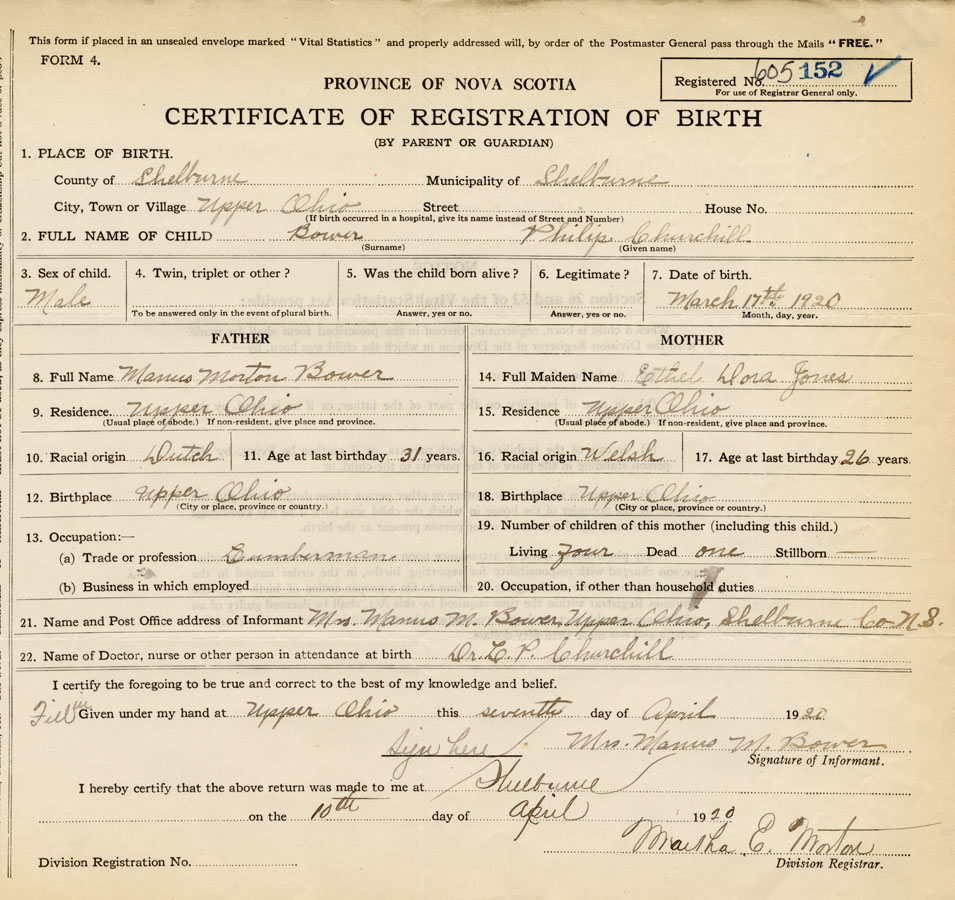 21. Name and Post Office address of Informant Mrs. Manus M. Bower Upper Ohio, Shelburne Co.