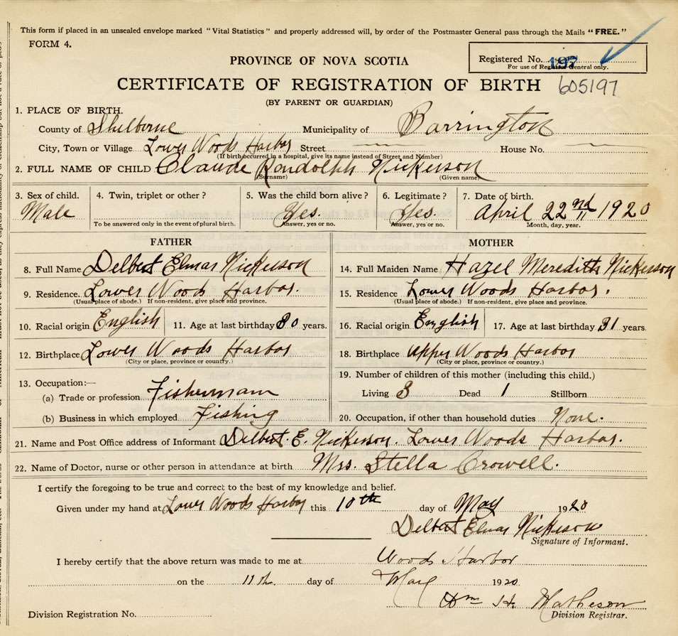 18. Birthplace Upper Woods Harbour, Shelburne County
