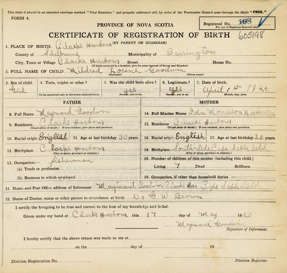21. Name and Post Office address of Informant Maynard Goodwin Clarks Harbour, Cape Sable Isld.