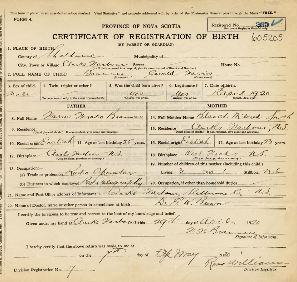 21. Name and Post Office address of Informant H. H. Brannen Clarks Harbour, Shelburne Co.