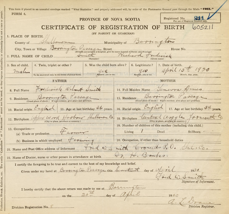 12. Birthplace Upper Wood Harbour, Shelburne Co.