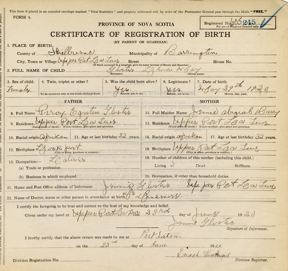 21. Name and Post Office address of Informant Jennie Gloster Upper Port La Tour