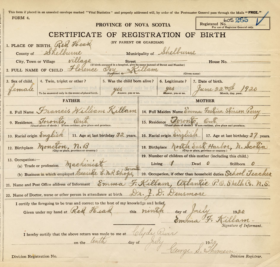 2. FULL NAME OF CHILD Killam, Florence Ivy