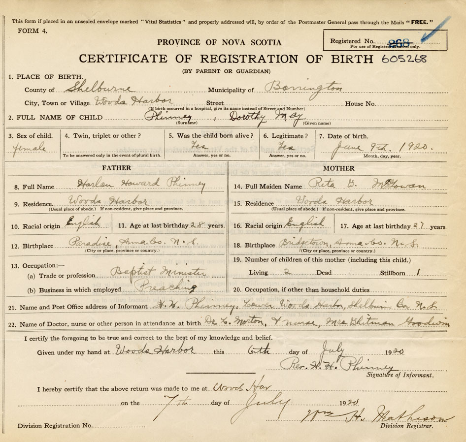 21. Name and Post Office address of Informant Rev. H. H. Phinney Lower Woods Harbor, Shelburne Co.