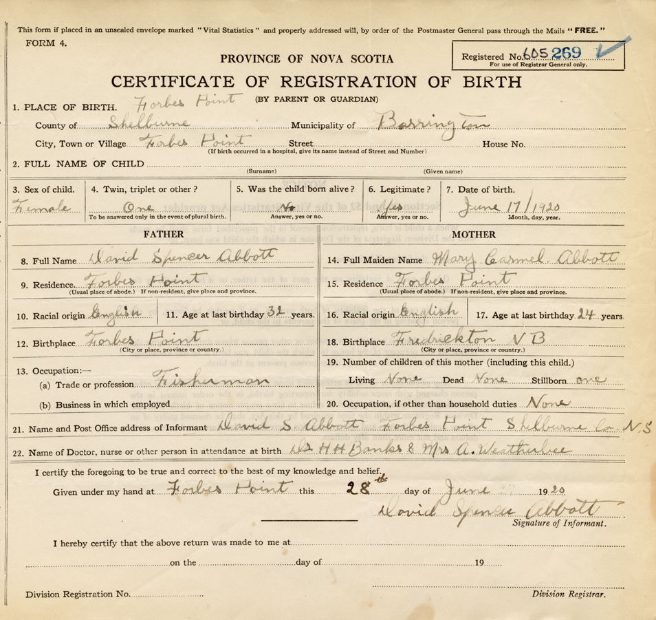 21. Name and Post Office address of Informant David Spencer Abbott Forbes Point, Shelburne Co.