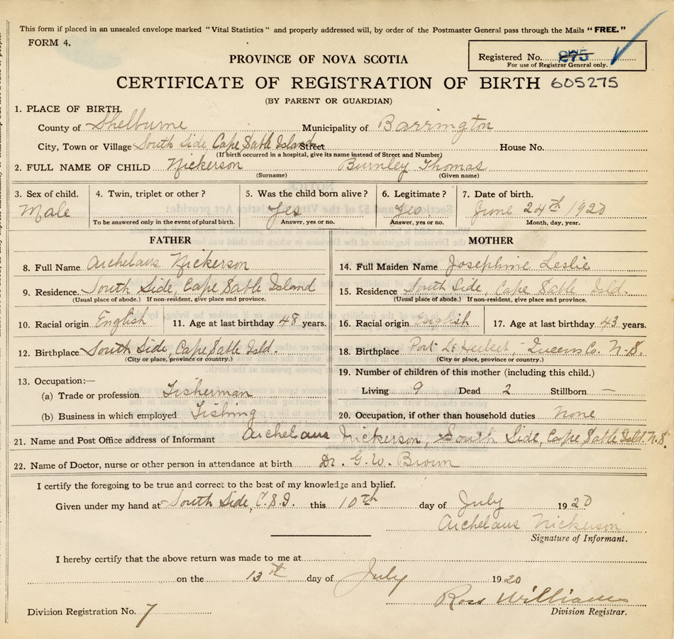 21. Name and Post Office address of Informant Archelaus Nickerson South Side, Cape Sable Isld.
