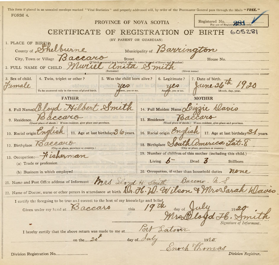 21. Name and Post Office address of Informant Mrs. Lloyd H. Smith Baccaro, N.S