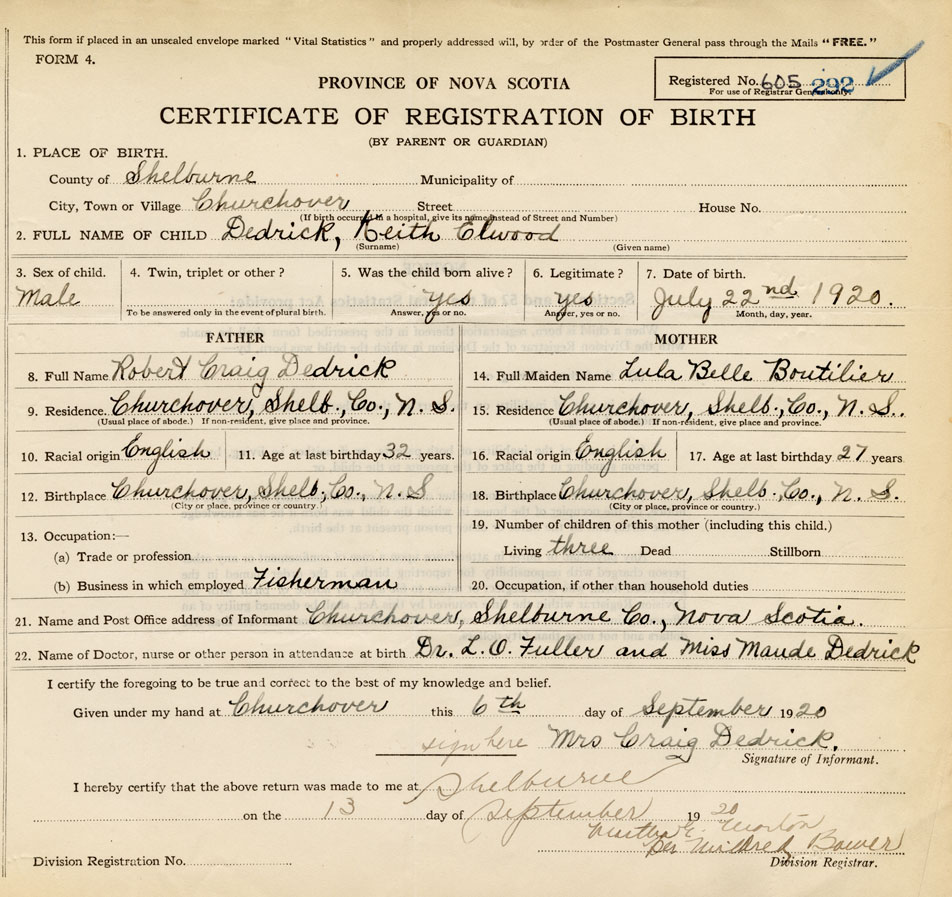 21. Name and Post Office address of Informant Mrs. Craig Dedrick Churchover, Shelburne Co.