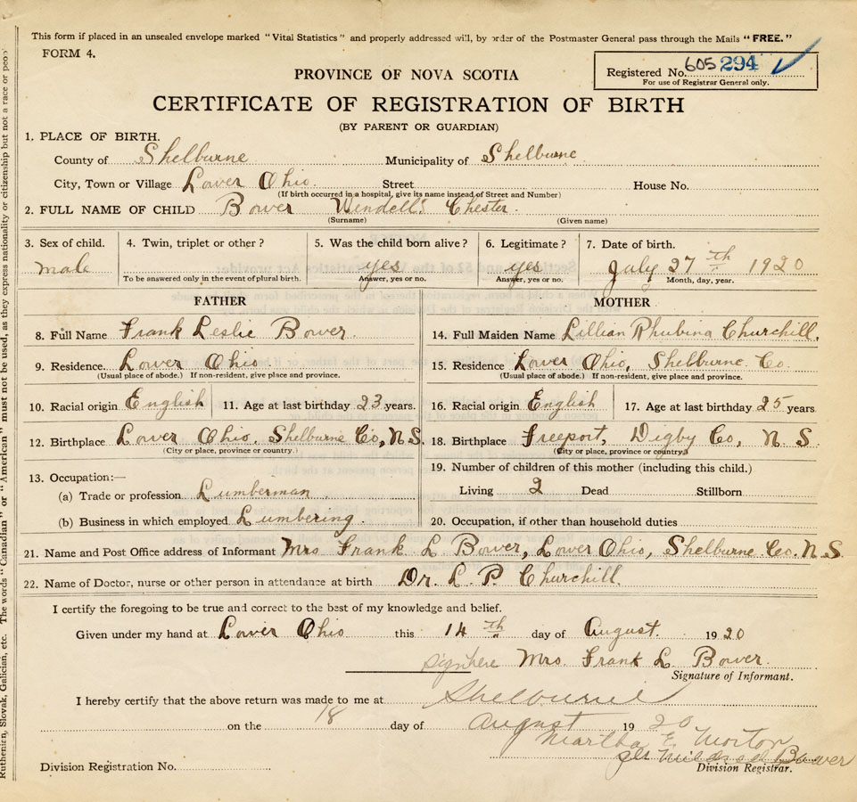 21. Name and Post Office address of Informant Mrs. Frank L. Bower Lower Ohio, Shelburne Co.