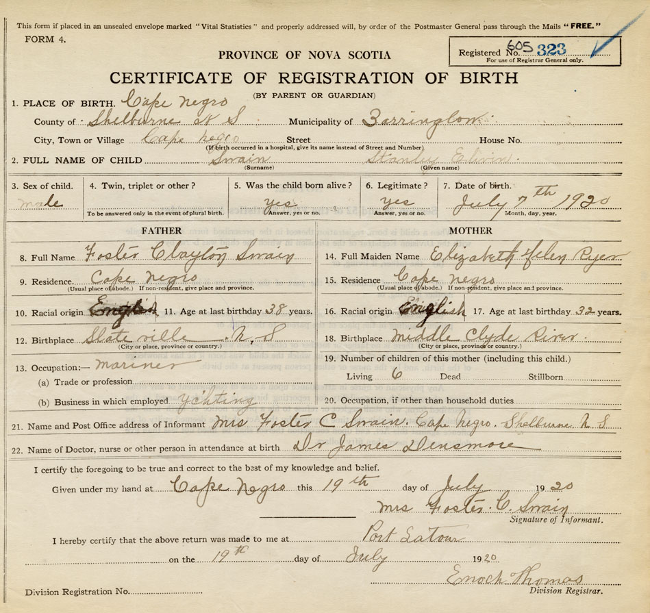 21. Name and Post Office address of Informant Mrs. Foster C. Swain Cape Negro, Shelburne