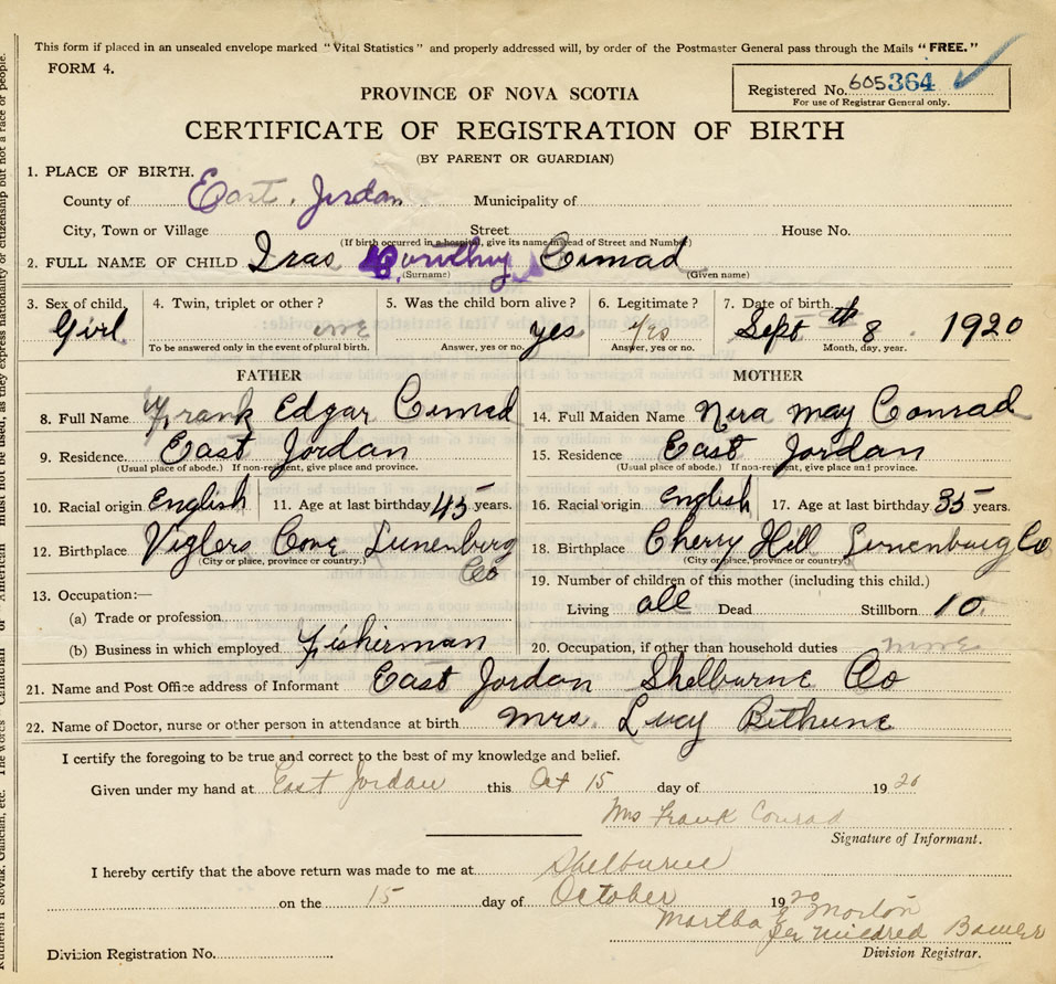 21. Name and Post Office address of Informant Mrs. Frank Conrad East Jordan, Shelburne Co.