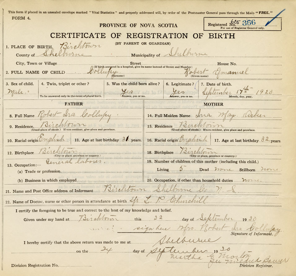 21. Name and Post Office address of Informant Mrs. Robert Ira Collupy Birchtown, Shelburne Co. N.S.