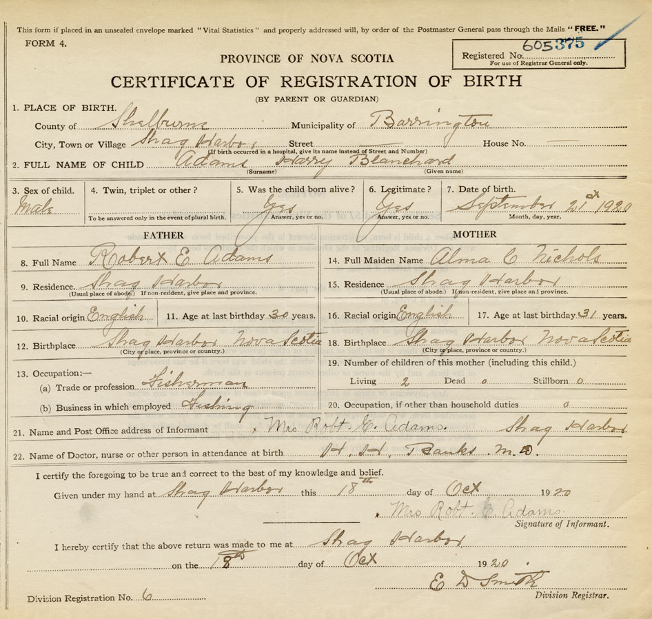 21. Name and Post Office address of Informant Mrs. Robt. E. Adams Shag Harbor