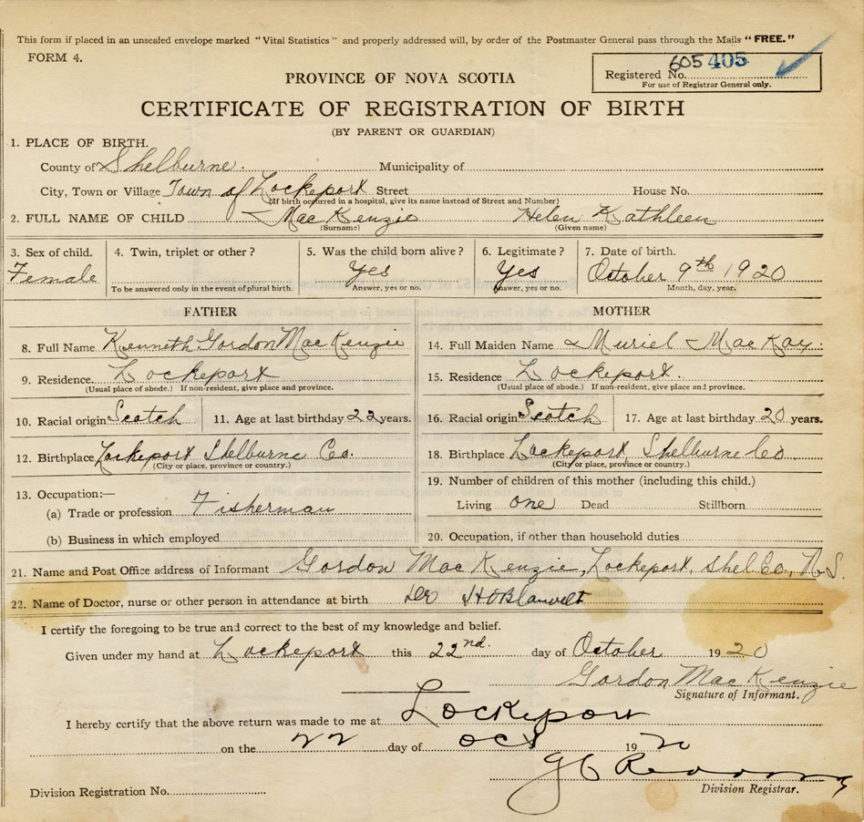 18. Birthplace Lockeport, Shelburne Co.