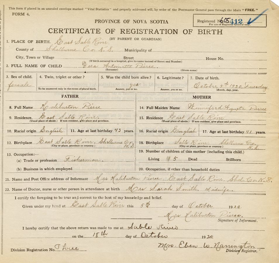 21. Name and Post Office address of Informant Mrs. Haliburton Pierce East Sable River, Shel. Co.