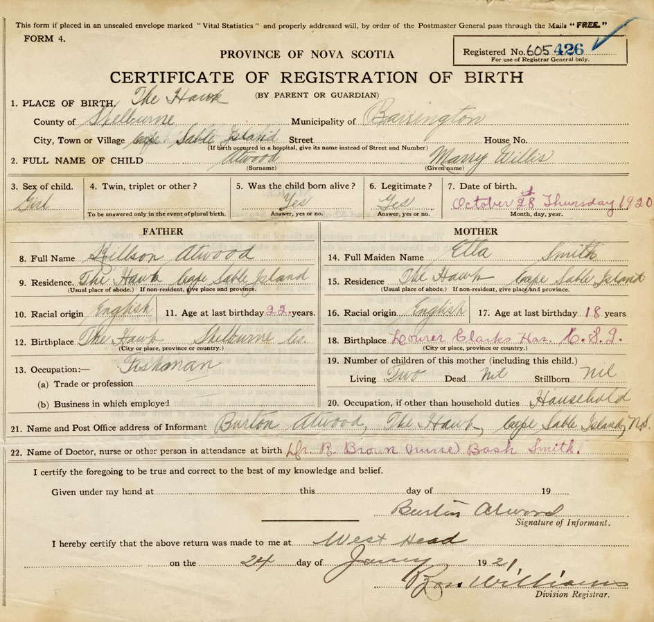 21. Name and Post Office address of Informant Burton Atwood The Hawk, Cape Sable Island