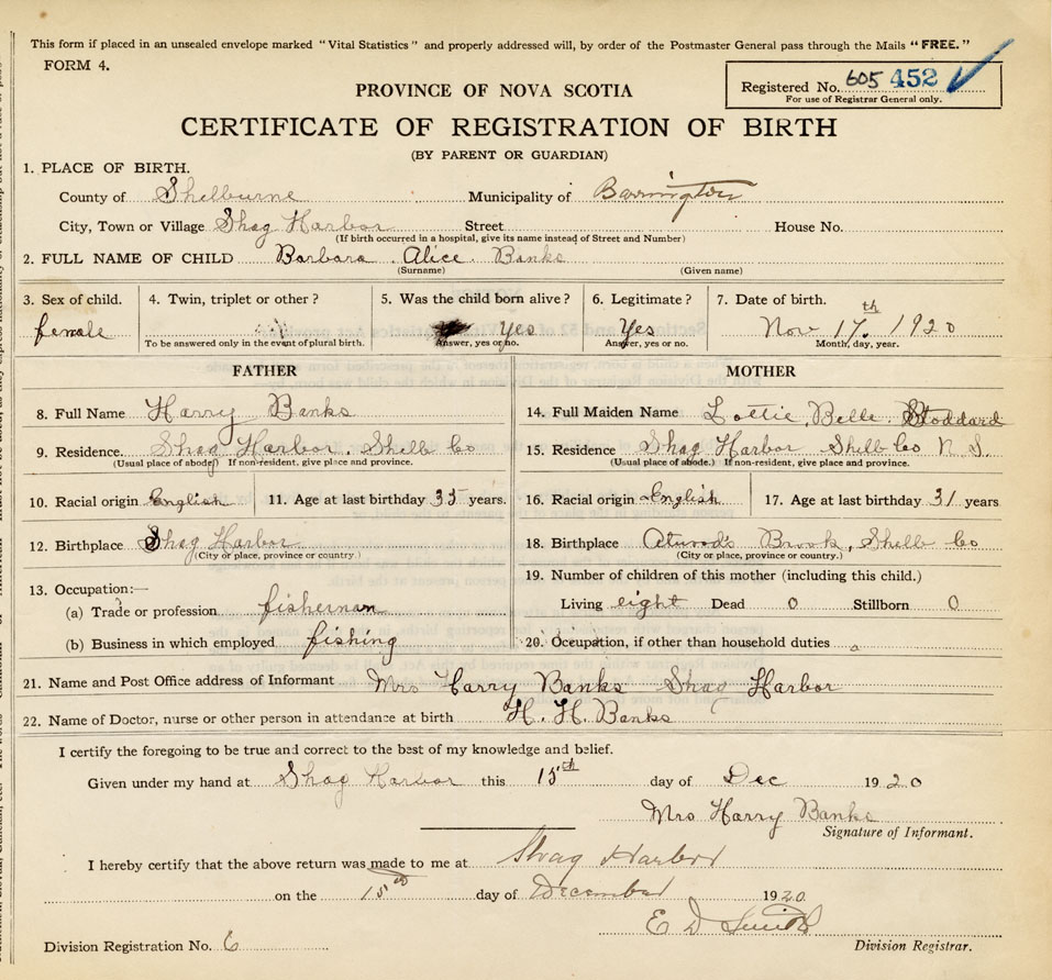 21. Name and Post Office address of Informant Mrs. Harry Banks Shag Harbor