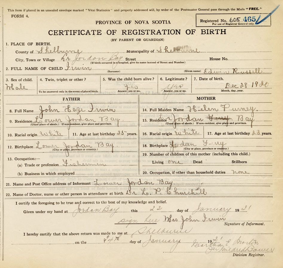 21. Name and Post Office address of Informant Mrs. John Irwin Lower Jordan Bay