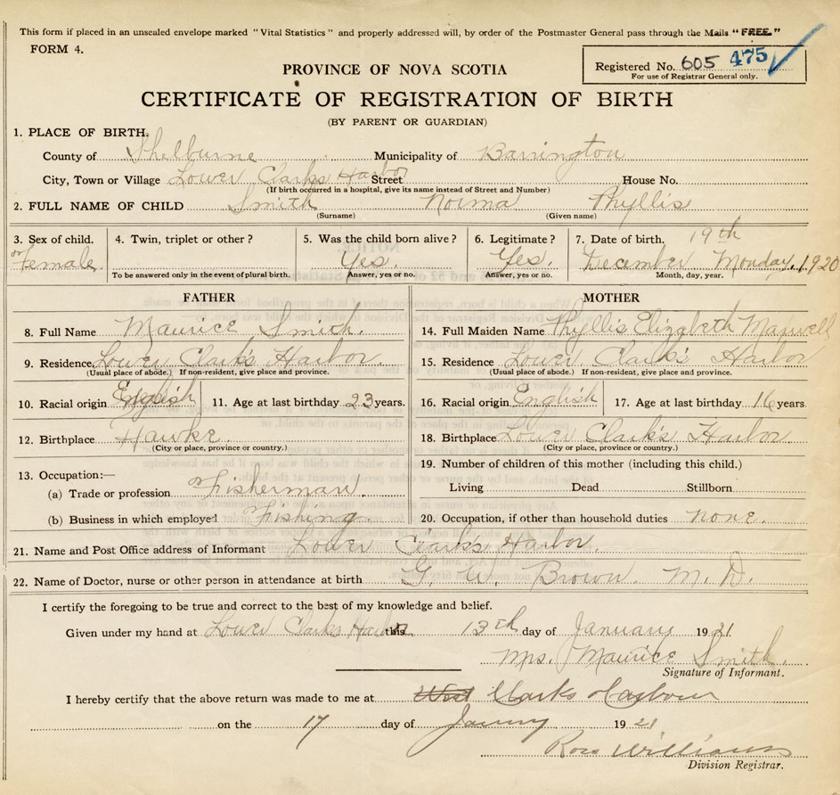 21. Name and Post Office address of Informant Mrs. Maurice Smith Lower Clarks Harbor